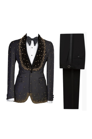 Style:Prom Suits for Men Features- The Blazer features shawl lapel, double breasted, one button and three patch pockets, with inside pockets. The Pants flat front,zipper fly,button end and adjustable waist,two front slash pockets.